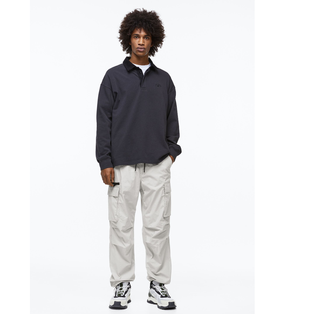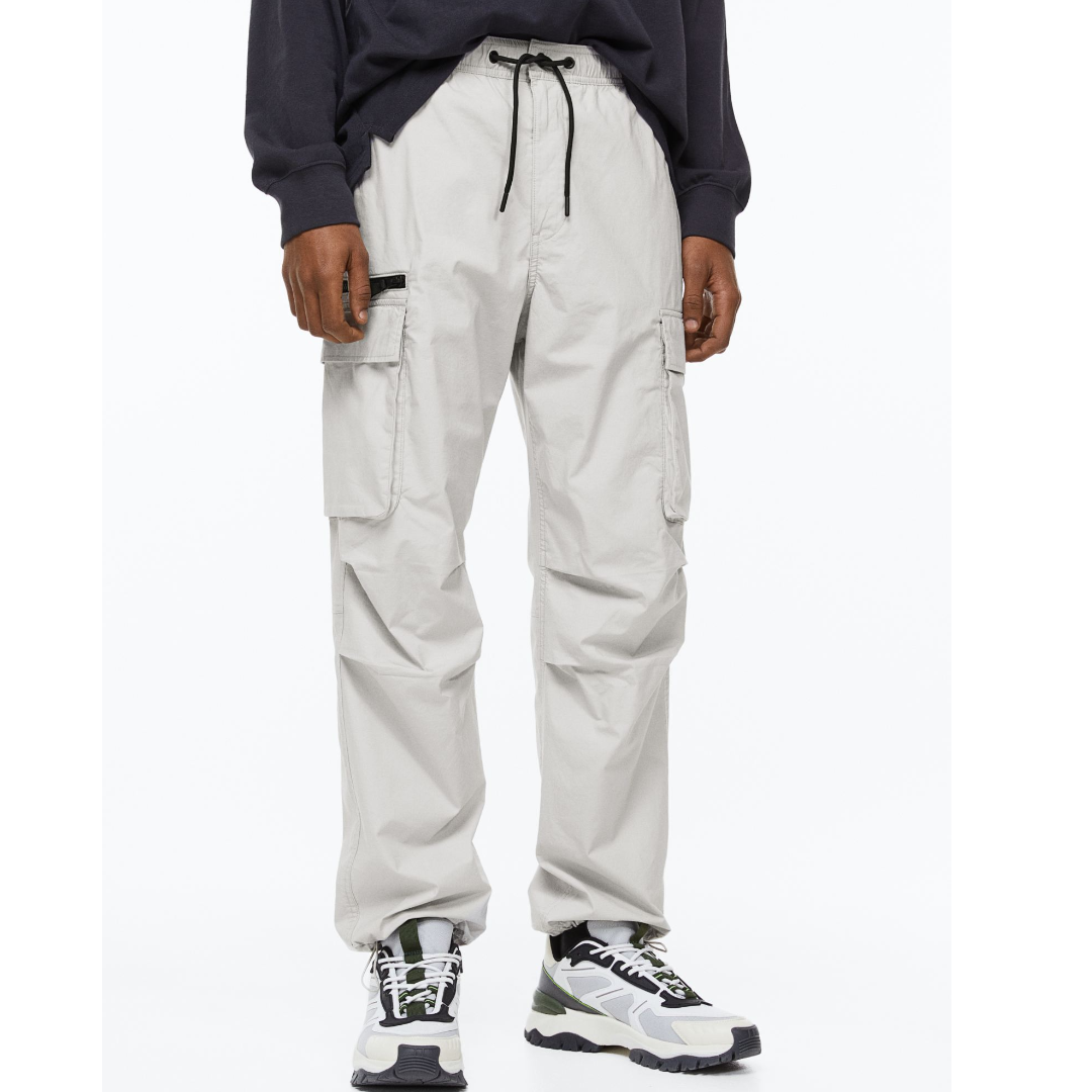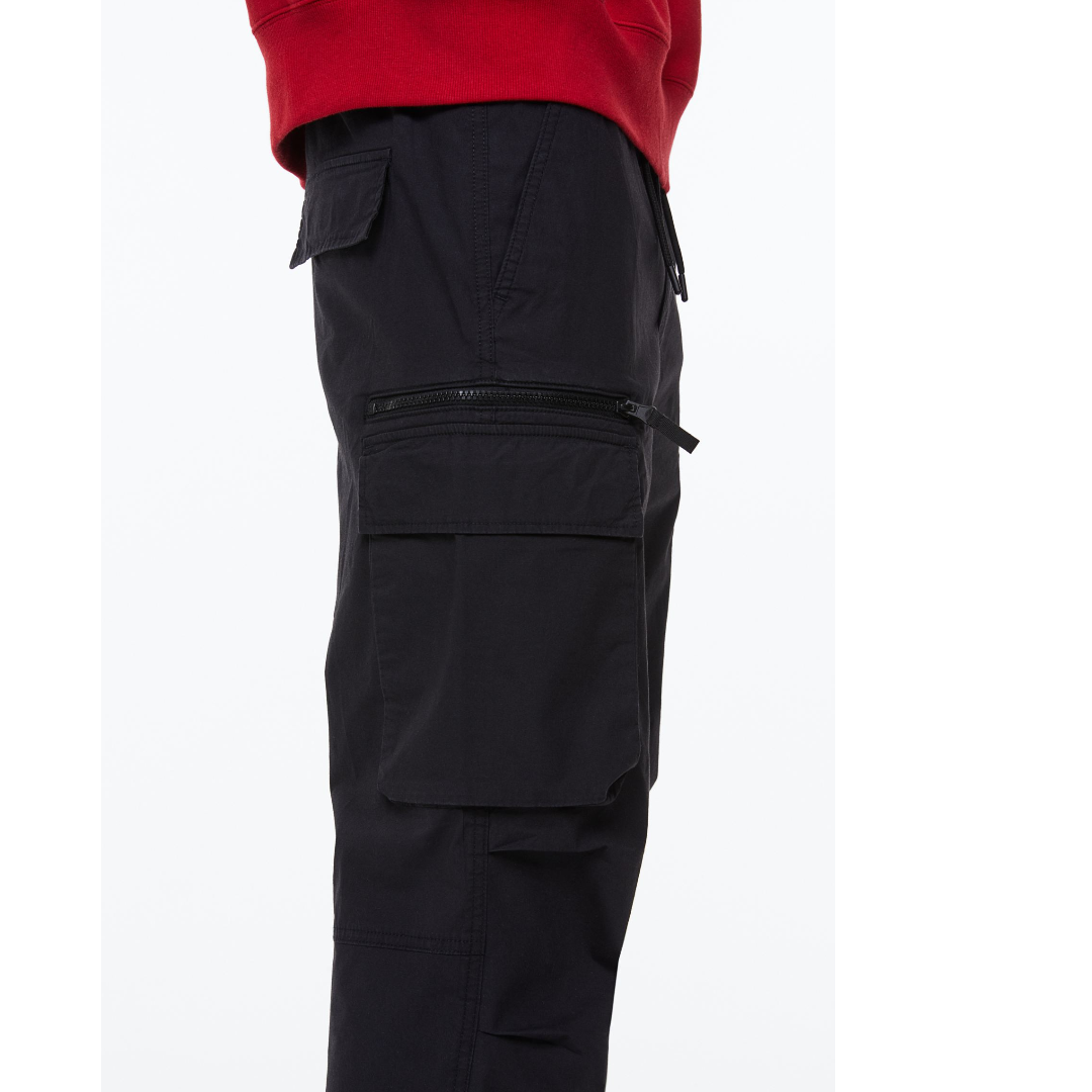 Relaxed-fit pants in woven cotton fabric. Regular waist, drawstring and covered elastic at waistband, seams at knees, and elasticized drawstring at hems. Diagonal side pockets, back and leg pockets, all with flap and hook-loop fastener, and a concealed leg pocket with zipper.